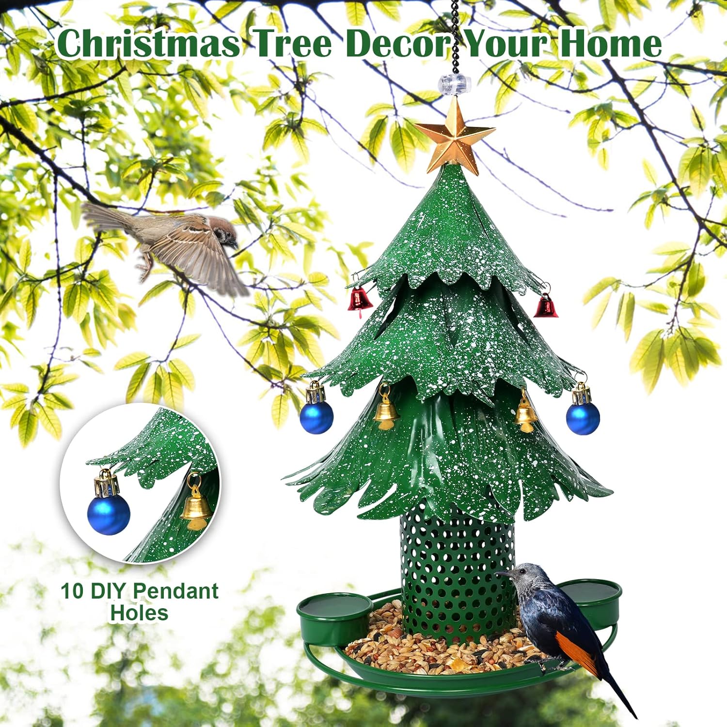- 【Cute Bird Feeder】: 2025 new bird feeder. Delicate Christmas tree shape, bright golden five-pointed star, and snow-green Christmas leaves create this novel bird feeder.Each of our Christmas tree bird feeders are carefully handcrafted by artisans. It's not just a Christmas Tree bird feeder, it's a tree of life.Breathing new life into spring.A good choice for present